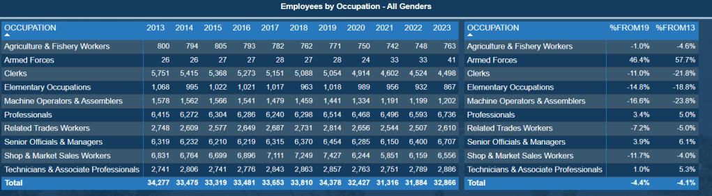 There has been an overall fall in employment since 2013 of 4.1%, with the main growth coming through ‘white-collar’ occupations such as Professionals and Senior Managers, and falls across the ‘blue-collar’ occupations. Notably, Clerks are down 22%, Elementary Occupations are down 19% and Machine Operators & Assemblers are down 24%. This dynamic has continued throughout the time period.