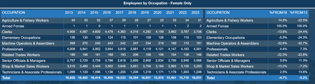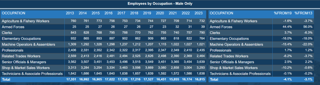 For males, positions have generally been more stable, with the highest growth in absolute terms being in Professionals and Senior Officials & Managers – combined adding some 120 positions. The largest decreases have been across Machine Operators & Assemblers, Elementary Occupations and Related Trade Workers. This shift speaks to the overall trends in the economy – with ‘blue collar’ jobs decreasing and ‘white collar’ jobs growing.