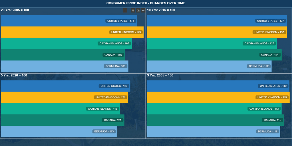 Despite sourcing most goods and services from the included economies, Bermuda has demonstrated lower CPI, particularly over the past 5 years. in a future analysis we will look at productivity over that time, and how the price rises correlate with output.